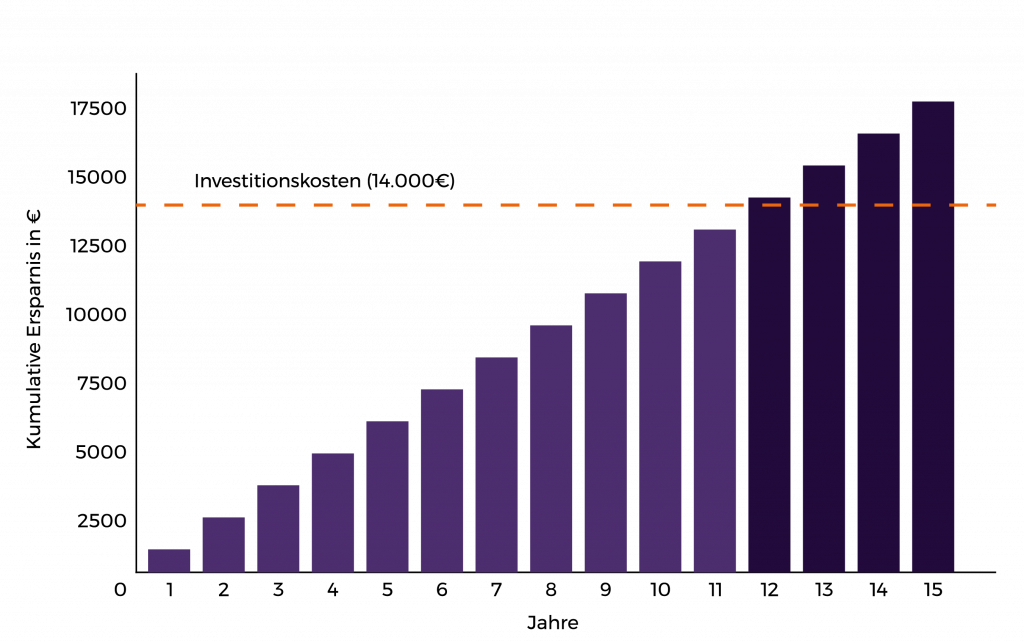 In vielen Fällen liegt die jährliche Ersparnis bei rund 1.200 Euro. Auf 10 bis 12 Jahre gesehen haben Sie Ihre Investition von 14.000 Euro vollständig über die gesunkenen Energiekosten refinanziert. In manchen Fällen sogar schneller, zum Beispiel wenn Sie bereits eine Photovoltaikanlage betreiben oder wenn die Energiepreise weiter steigen. Und danach? Danach spart Ihre Heizung einfach weiter – Jahr für Jahr.